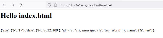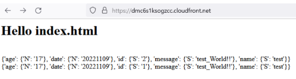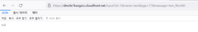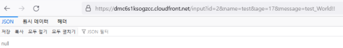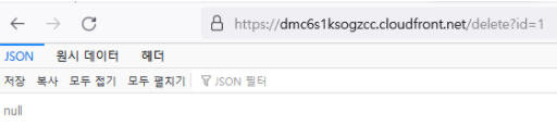이제 cloudfront 주소에서 /delete?id=1 을 넣어 1을 삭제시켜 주었다.