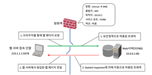 세션 정보를 저장해 두고 동일 세션에 대해서는 방화벽 로직을 태우지 않고 통과시키기 때문에 보안 허점 없이 방화벽 장비의 성능상 우위를 갖게 된다.