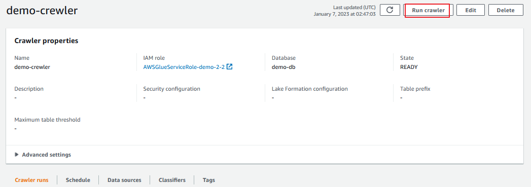 Run crawler 버튼을 눌러 crawler을 실행하도록 한다.