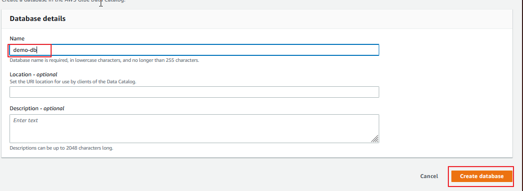 우선 먼저 database부터 생성해주어야 한다. glue console에서 database 항목에 들어가 사진과 같이 생성해 주도록 한다.