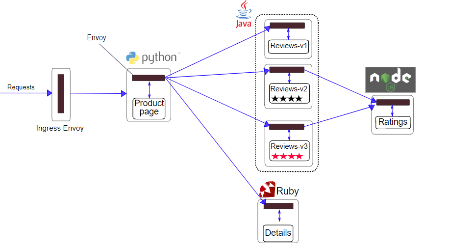 해당 사이트의 sample file의 동작 구조이다. 사진을 살펴보면 requests 요청을 ingress로 전송을 한다. 해당 ingress는 외부에서 내부로 접속하는 로드밸런서라고 생각하면 된다. < ingress URL >/productpage라는 페이지로 requests 요청을 전송하면 Envoy proxy를 통해 Product 페이지가 반환이 되고, 아래사진과 같이 reviews, details 항목이 표시된 걸 볼 수 있다.